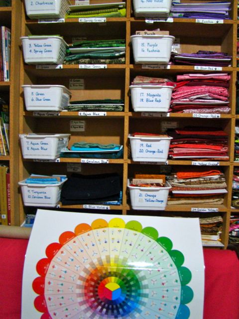 Fabric here, there, and everywhere! As I’m a fan of Joen Wolfrom’s colour theory, the fat quarters and bigger pieces are sorted into the 24 colours. This highlights colours I’ve used and the colours that are missing from the palette. Themed fabrics and panels have their own space on the shelves.