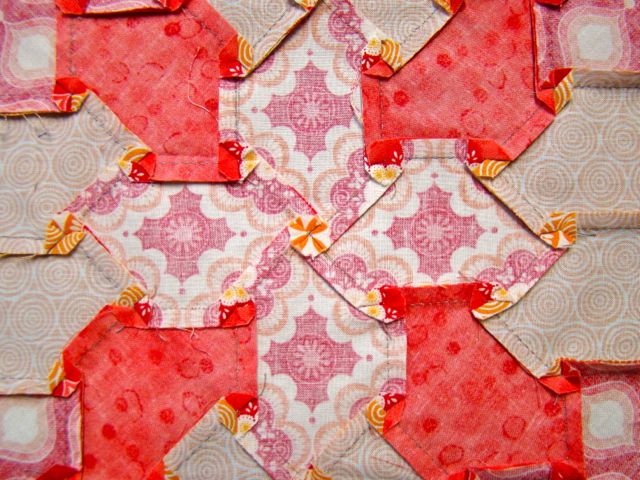 Time to update what’s happening with the ‘Salamander’ Patchwork of the Crosses runner. Now that the three hand pieced blocks are finished, it’s time to turn the edges ready for hand appliqué to the background. All seams are ironed into a rotating ‘whirligig’ pattern, beginning from the centre of the block. This helps avoid a ‘hill’ of fabric at the ‘Y’ join, so the block lays flat.