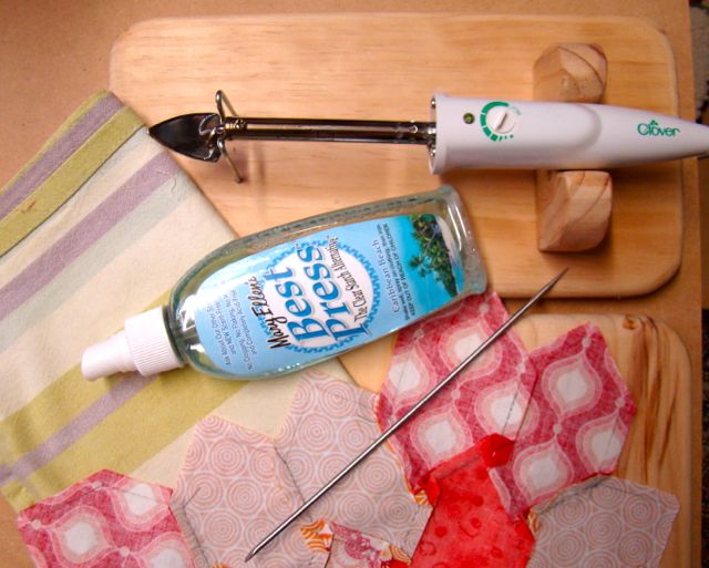 The tools I use for this turned edge technique include a timber board covered with an old tea towel; ‘Mary Ellen’s Best Press’; the ‘Appliquick’ tools, and a Clover mini-iron.