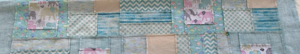 And yes, it’s ‘fussy cut’ for horizontal layout of all those fabrics! The border fabric was a disappointment because it looked straight on the bolt but when it came to cutting it up into patches, the print was definitely not straight! Came out okay around the feature fabric (elephants), but in the longer border pieces it’s wonky – but I don’t think the baby will mind!