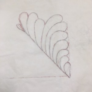 This one has sat around unquilted just waiting for the right time – and so it seems that’s now! Also in the cupboard is some of ‘Matilda’s Own Aqua Web’ ready for playtime. Saw this used – way back when – for quilting and pulled it out to have a go. What design to use on the block reminded me that’s exactly why it’s been waiting so long. So bit the bullet, and drew on paper a ‘feather’, then flipped and traced it onto the Aqua Web, placed the web on the block and started stitching.