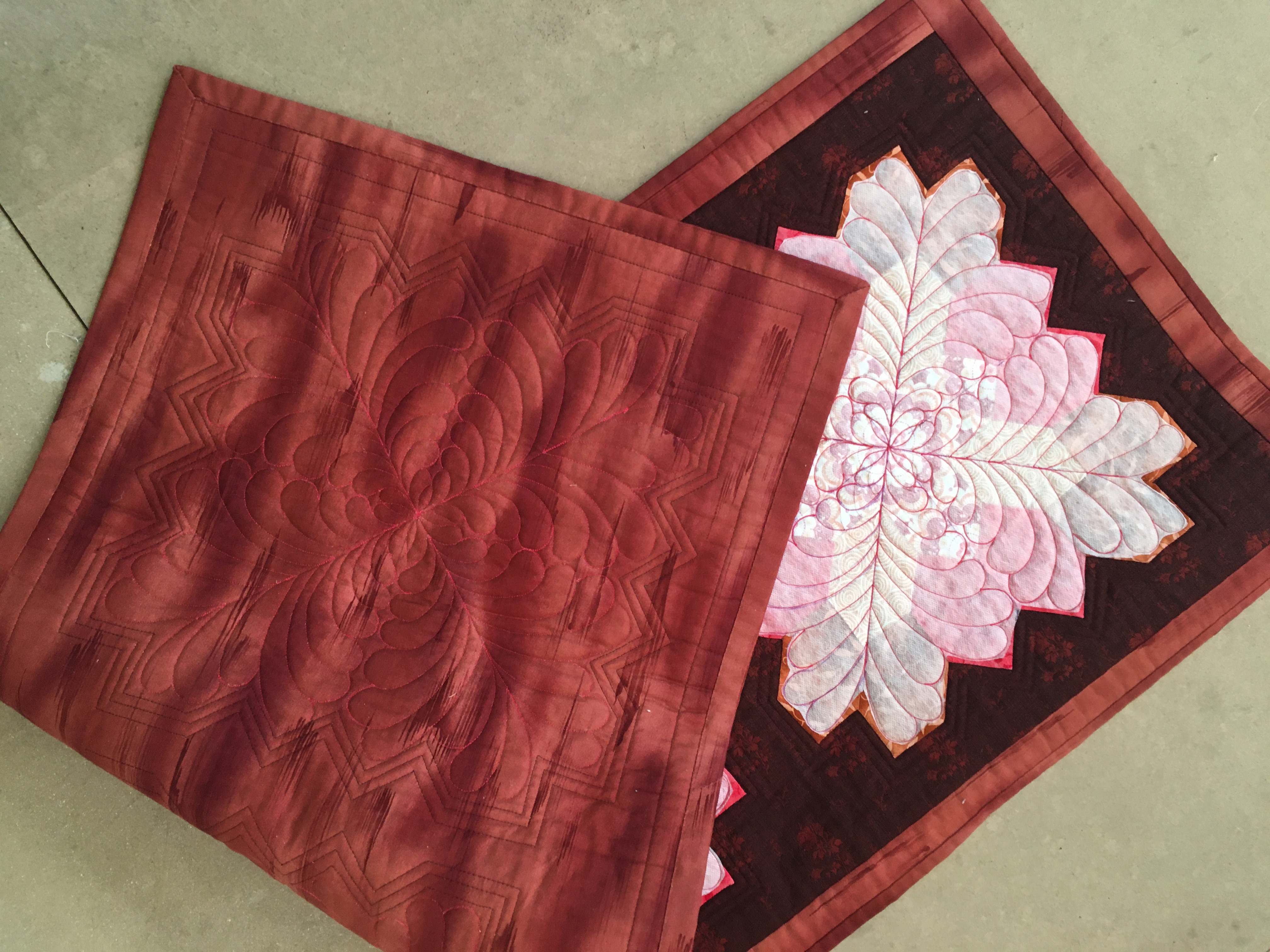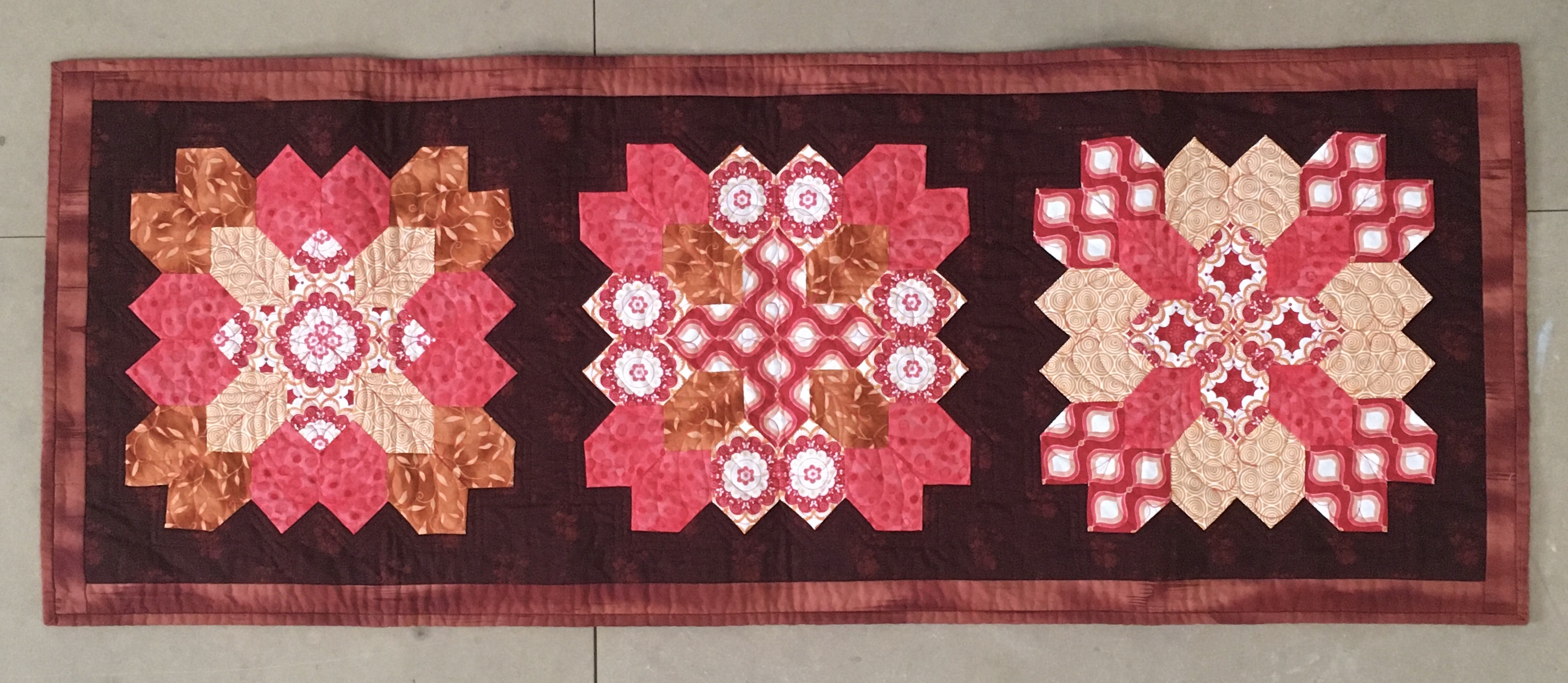 Using a few fat quarters that caught my eye to experiment with, there are now a couple of table runners in the collection. Lisa at ‘Sunset Seams’ made acrylic templates in 1.5″ size – as I prefered both a larger size than the standard 1″ and to hand-piece at that time – another phase on the journey! (Have you been through this phase too?)
