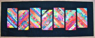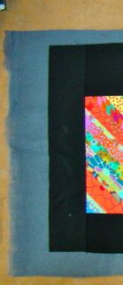 What quilting design to use for this piece was a challenge. With a strong geometric and straight line pattern nothing curved or floral would suit it, so what to do? As Deb Layt says, ‘Let the quilt tell you’, so over a few days of just looking at it came the decision to extend some of the straight lines from the stripes out to the edges. Along the top border going in one direction, and on the lower border, going the opposite direction with nothing crossing over.
