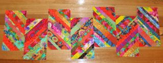 Varying widths of strips of Kaffe Fasset fabrics were sewn to a wash away interfacing, using the flip and sew method. Trimmed back to a uniform rectangular shape, the original pattern had them laid out in a chevron row. I thought it could have a better visual design by staggering the blocks, so laid them out on the floor. You know when you get that niggly feeling that it’s not quite right, (that’s usually when a project goes into the UFO pile), so I walked around it, and then went away from it for a while.