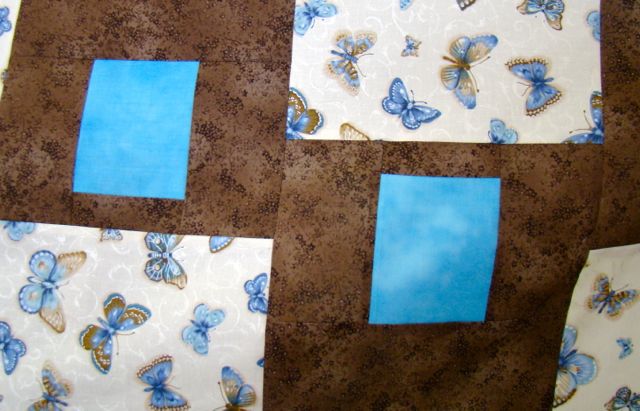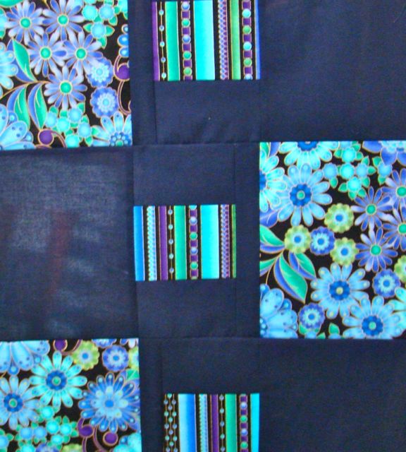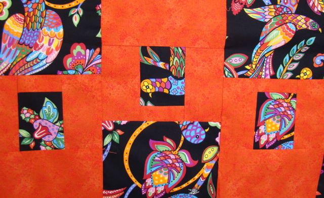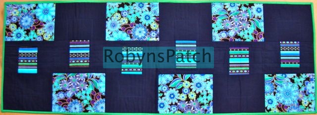 Another very easy to construct table runner is finished! The rich fabric pattern is set simply against a navy background, but what gives it a bit of a zing is the bright green binding. Quilting was a breeze, two lines in the background from end to end making a shape around the small patches. What I learnt with this project, was about quilt labels. In the Victorian Quilters handbook, there is a suggestion as to where to put labels on the back of a quilt. Apparently they go on the bottom left hand corner as you stand and face the back of the quilt. So from now on, that’s where the labels will go!