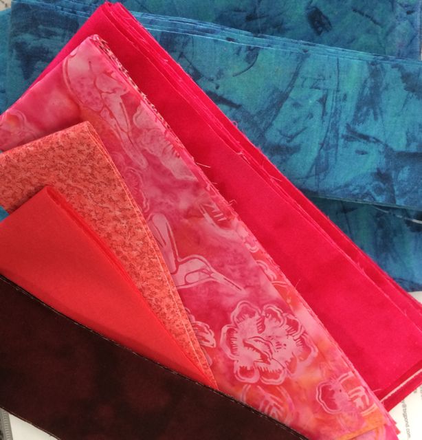 My eye went straight to magenta, then green, as the two main colours. They are supposed to be medium strength colour, but I haven’t been able to find enough in the green fabrics (yet!), a couple may be a tad bit too dark. Magenta fabrics were easier to find, but the most difficult to locate was the violet fabrics – perhaps more will come onto the market now that Pantone have named ‘Ultraviolet’ as their colour of the year.