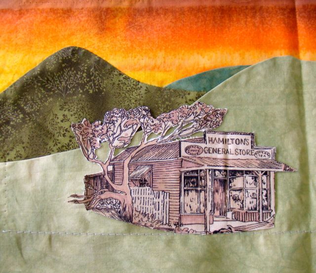 Julie decided to work smaller, so reduced the pattern by 50%. With a stash of fabrics printed with Australian homesteads, houses, and buildings, she is fussy cutting and appliquéing to build each panel.