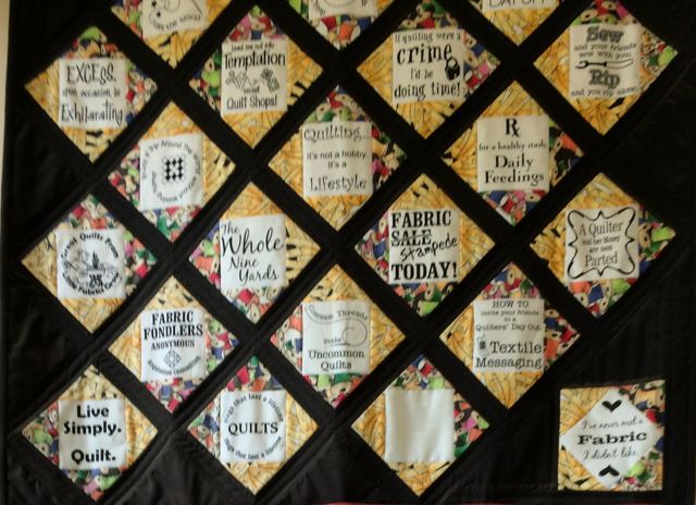 New Year’s Day was spent travelling around the ‘Victorian Goldfields’ area north of Ballarat with DH and DML. Of course it was ‘BOLO’ for any patchwork shops! Even though it was a public holiday – in the tourist town of Malden, the lovely shop The Village Patch was open, and what a delight it was! In the small entry way, hanging on the wall were two small quilts made up of little printed patchwork quotes. The simple on-point setting with a neutral fabric made a feature of the printed text. Perfect for a small quilted gift for a patchwork buddy!